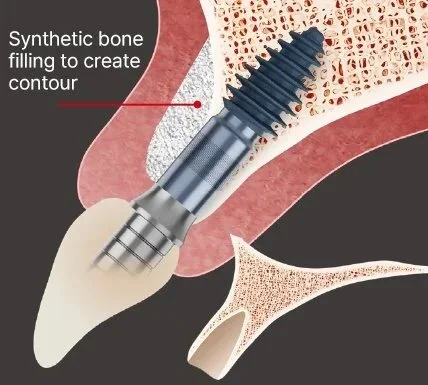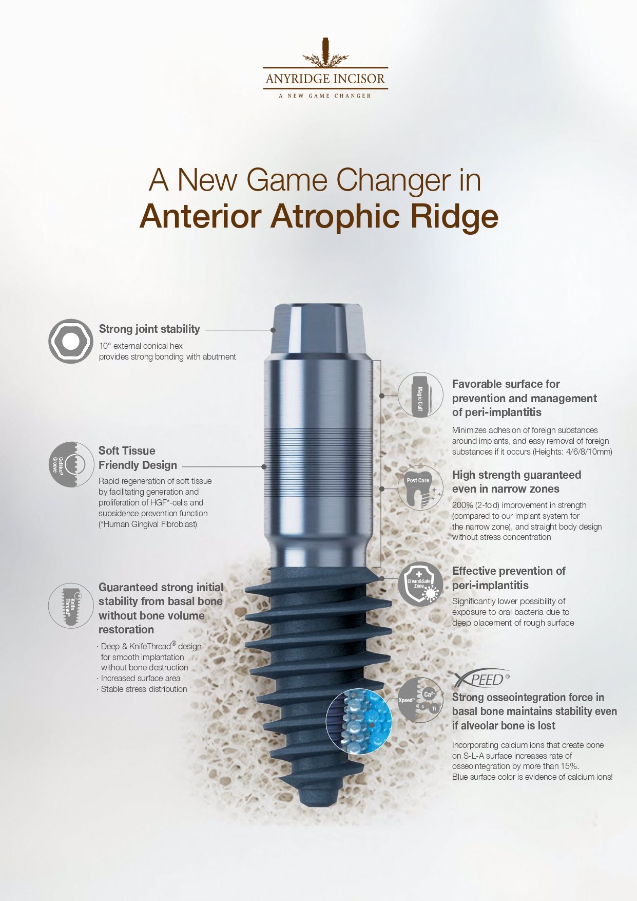 Implantaadi disain toetab ka tõhusamat järelhooldust ning aitab tagada pikaajalise stabiilsuse isegi juhul, kui alveolaarluu on taandunud.